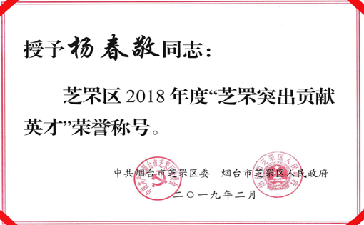 祝賀楊春敬先生榮獲2018年度“芝罘突出貢獻英才”榮譽稱號